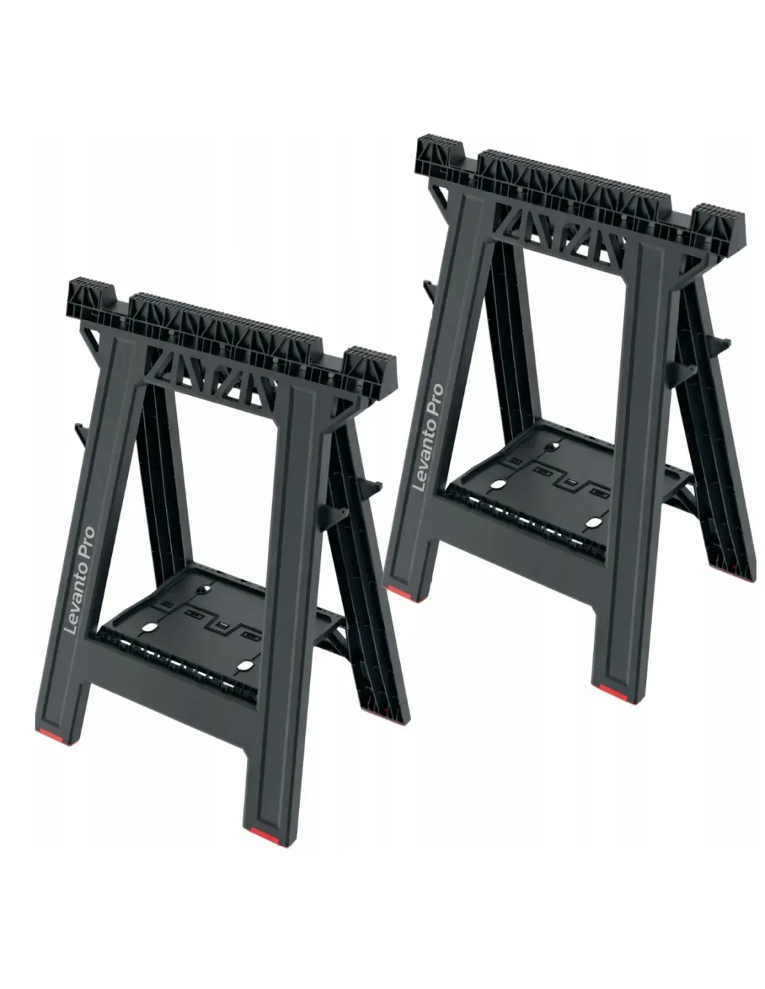 - 2 stojaki warsztatowe typu kobyłka z półką, każdy o wymiarach 76 x 58 cm i nośności do 175 kg.