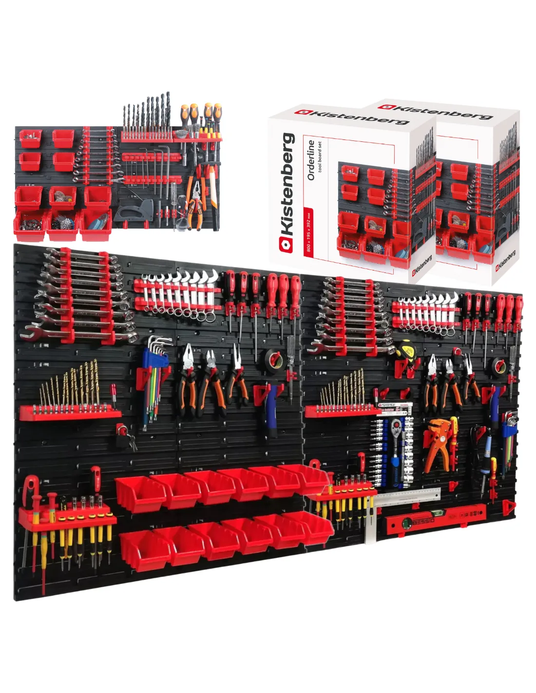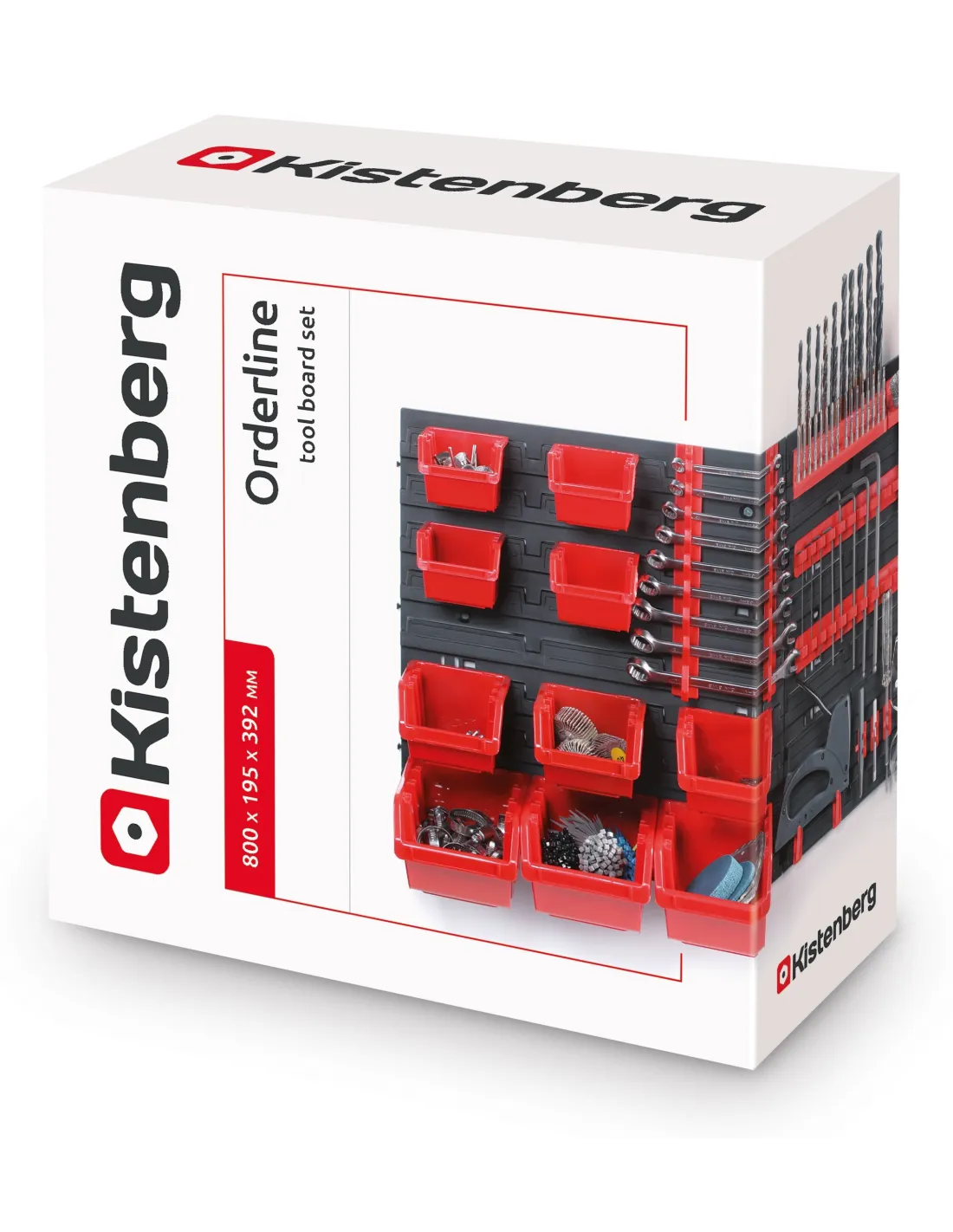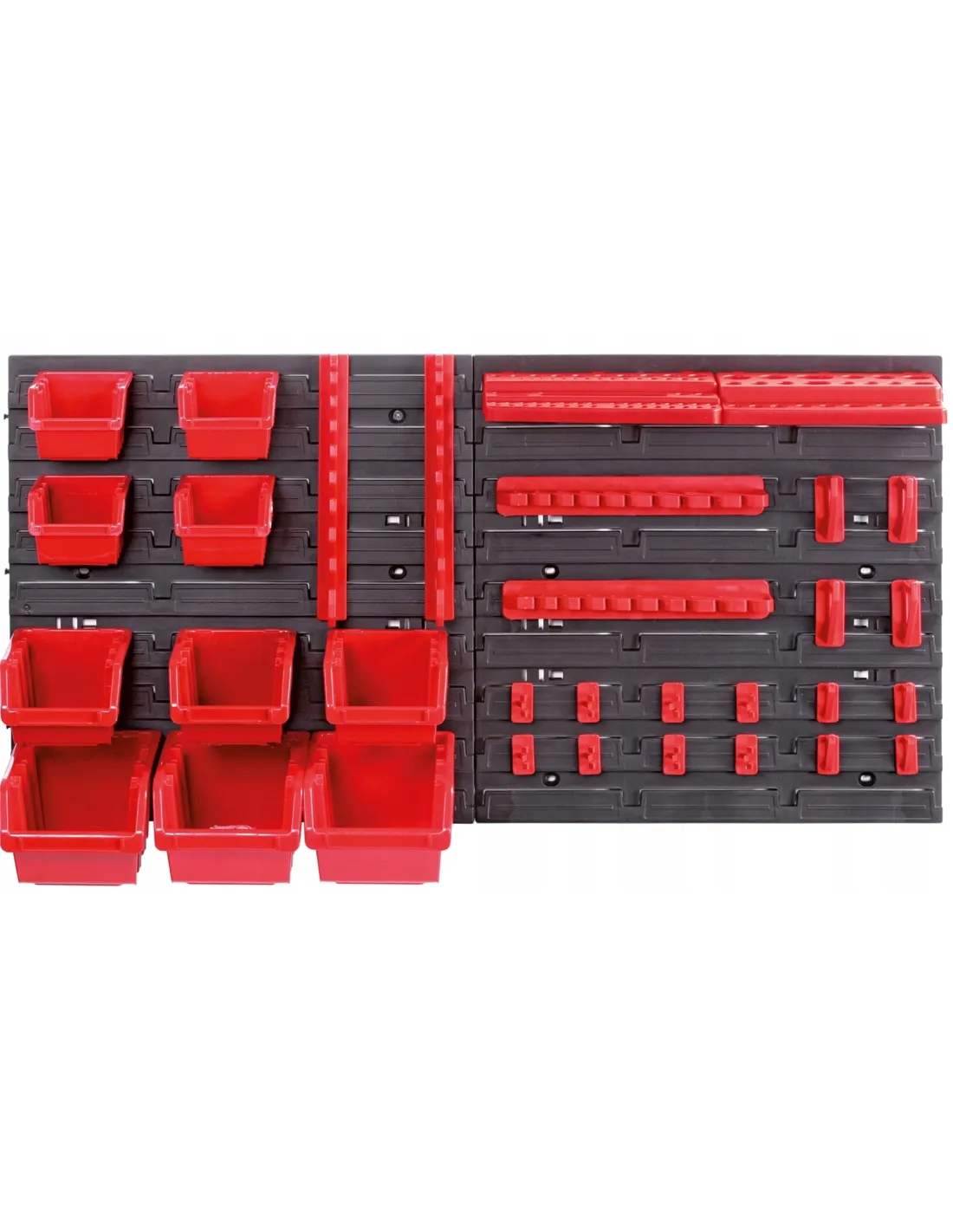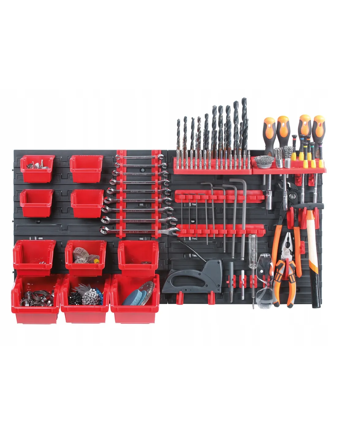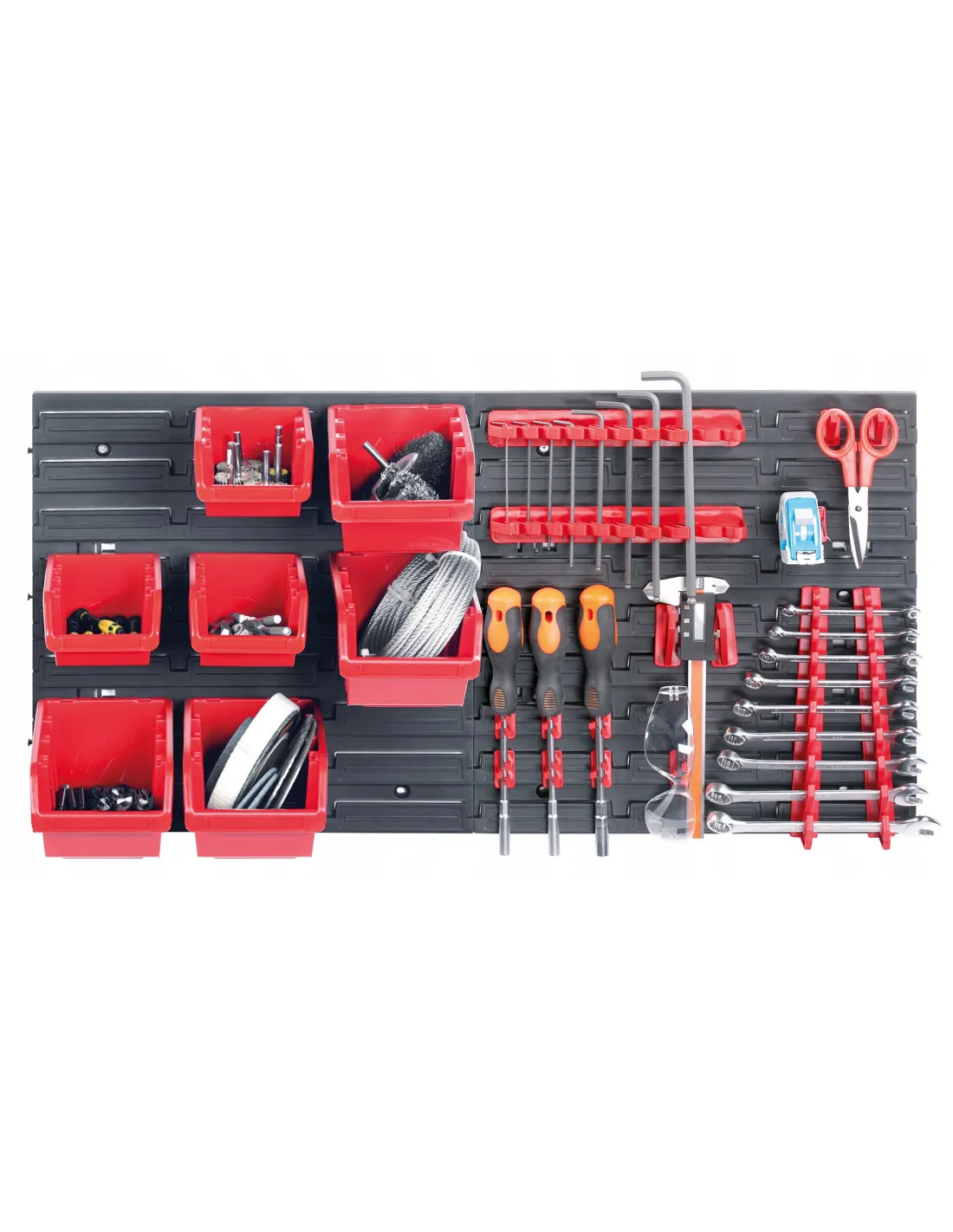 Łatwy montaż pojemników na tablicy pozwala na dowolne przemieszczanie ich w zależności od potrzeb. W każdej chwili można też pojemnik zdjąć, by uzyskać dostęp do zawartości. Dzięki uchwytom dołączonym do zestawu tablica szczególnie sprawdzi się w garażu czy warsztacie – wszystkie najpotrzebniejsze narzędzia będą zawsze pod ręką.
