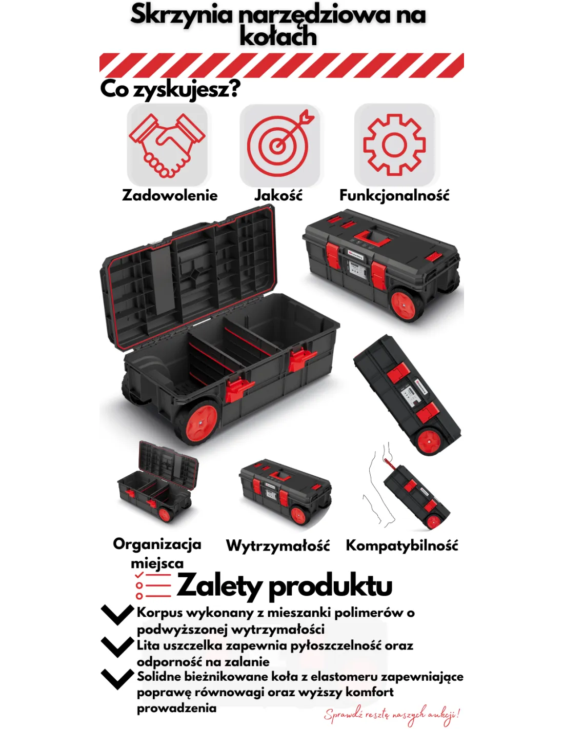 ➡️Wytrzymała skrzynia narzędziowa na kołach, która sprawdzi się w każdych warunkach. Została wykonana z najwyższej jakości mieszanki polimerów, zapewniając tym jakość oraz niewyobrażalną wytrzymałość produktu. Poświadcza to, że skrzynia może służyć jako podest roboczy, który wytrzyma obciążenie sięgające do 120 KG! Ładowność owej skrzynki to 50 KG, co umożliwia transport najcięższych narzędzi. Metalowe zawiasy, a co najważniejsze solidne bieżnikowane koła z elastomeru zapewniające poprawę równowagi oraz wyższy komfort prowadzenia skrzyni przy obciążeniu.